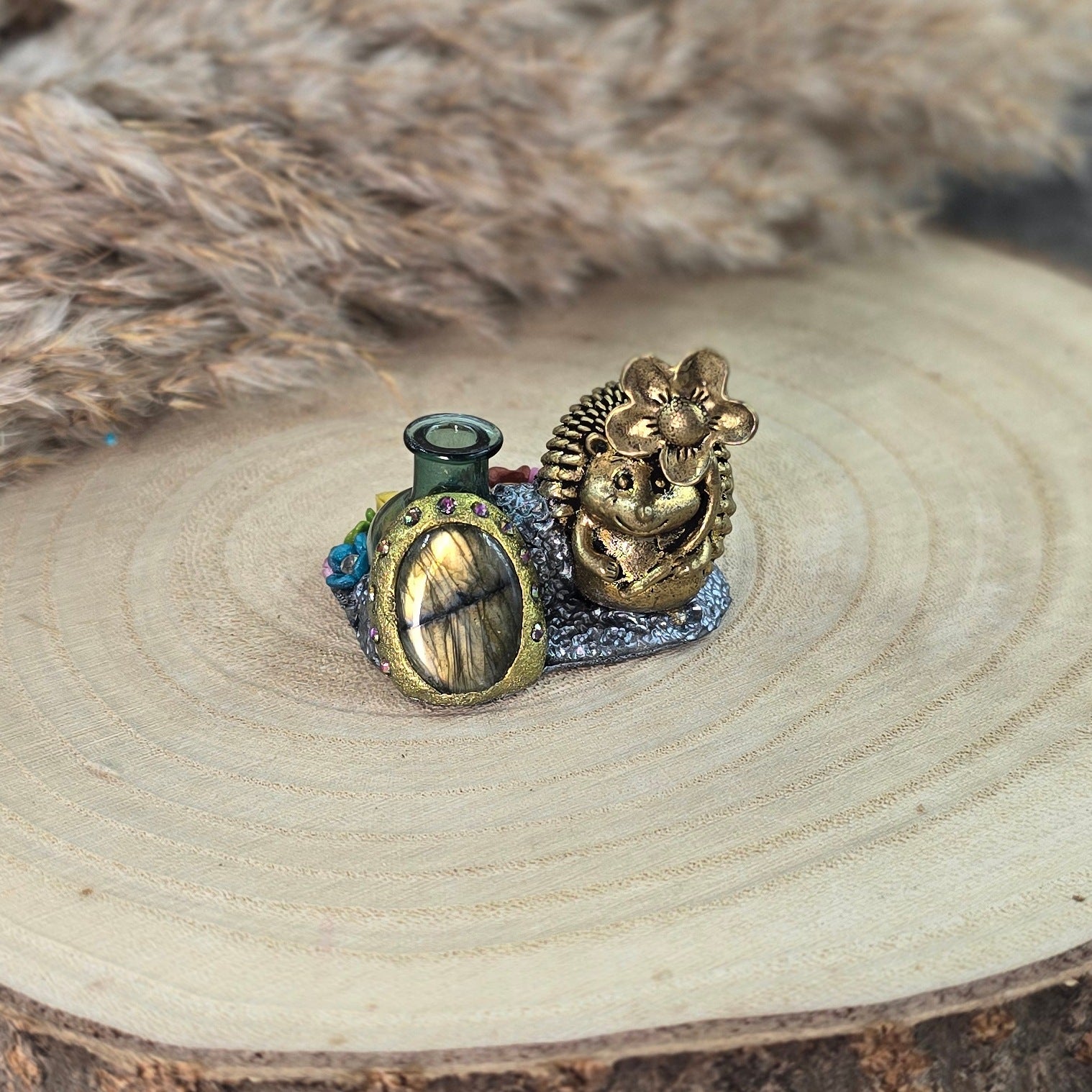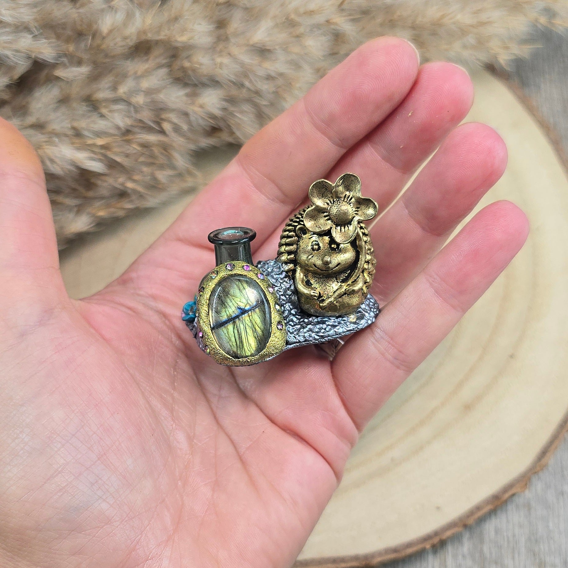 Medžiagos: žalvaris, stiklas, labradoritas, polimerinis molis, kristalai