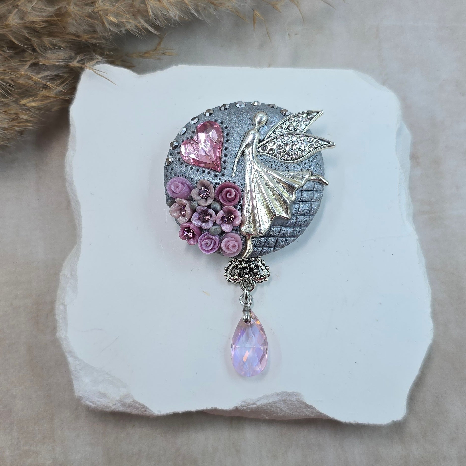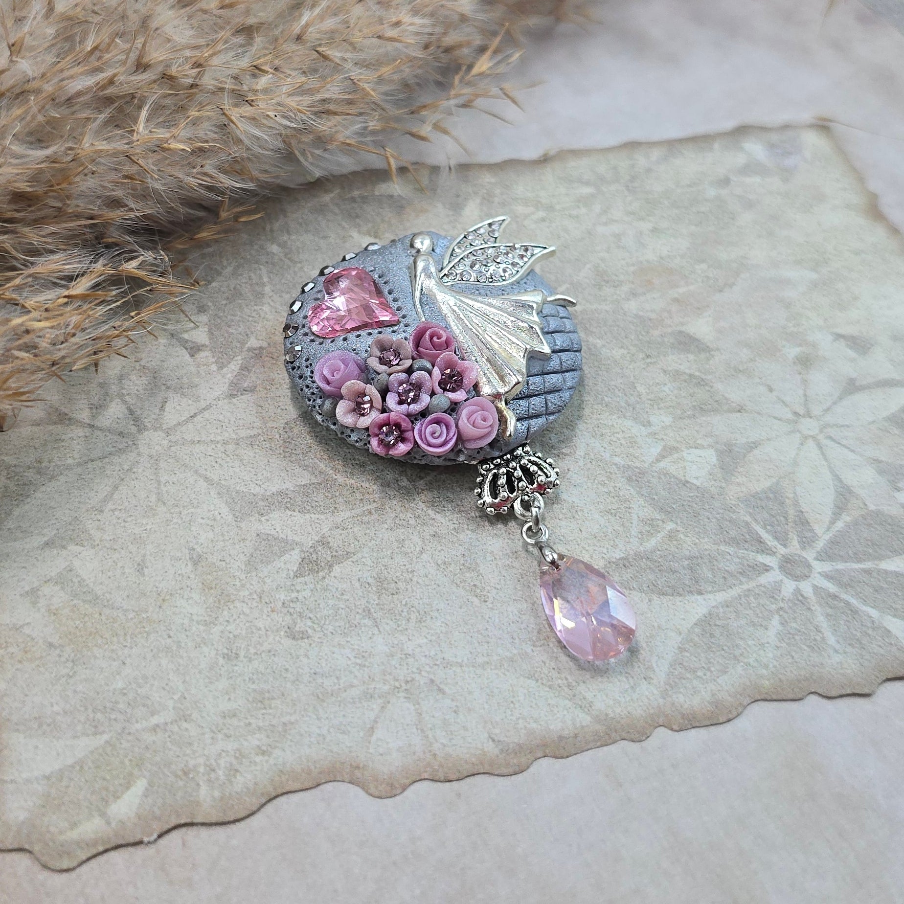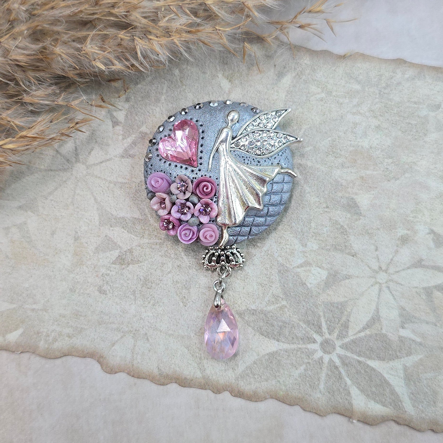 Švelniai rožinė sagė su fėja ir širdele