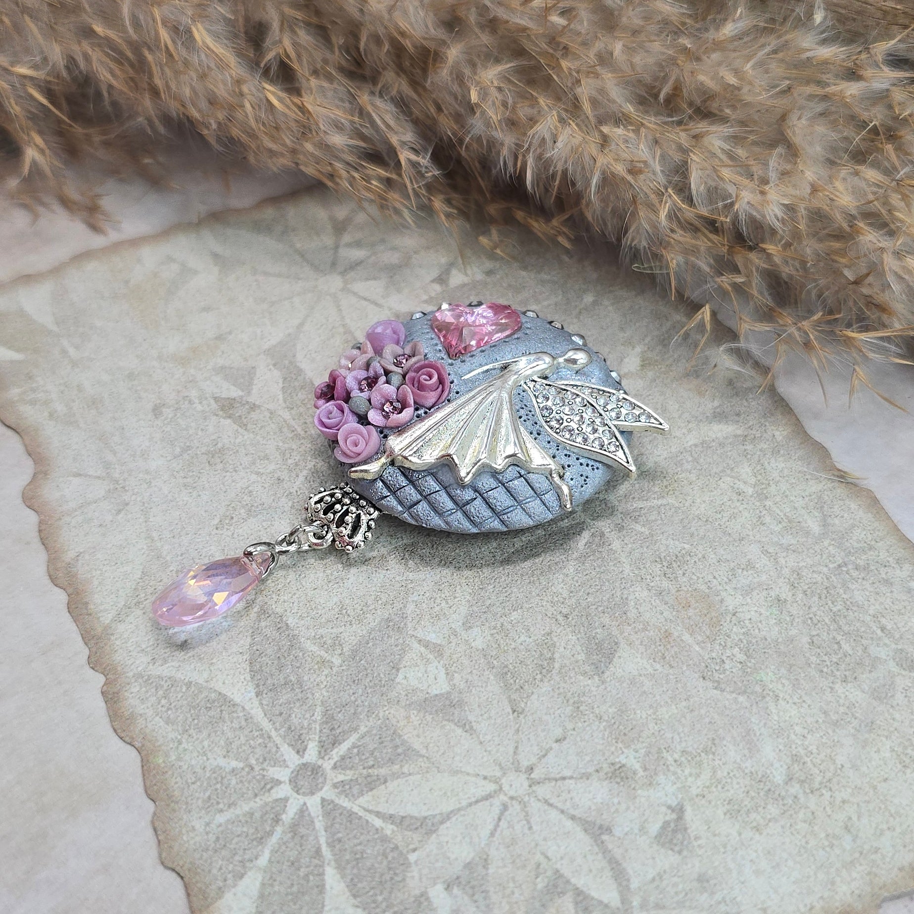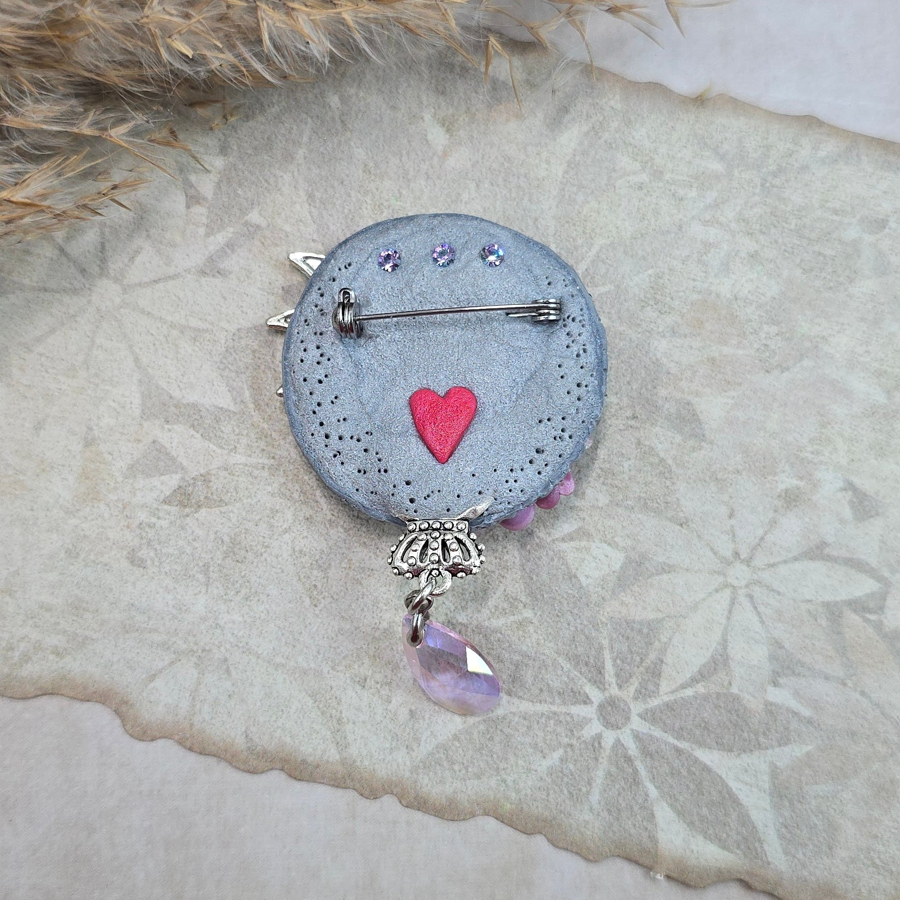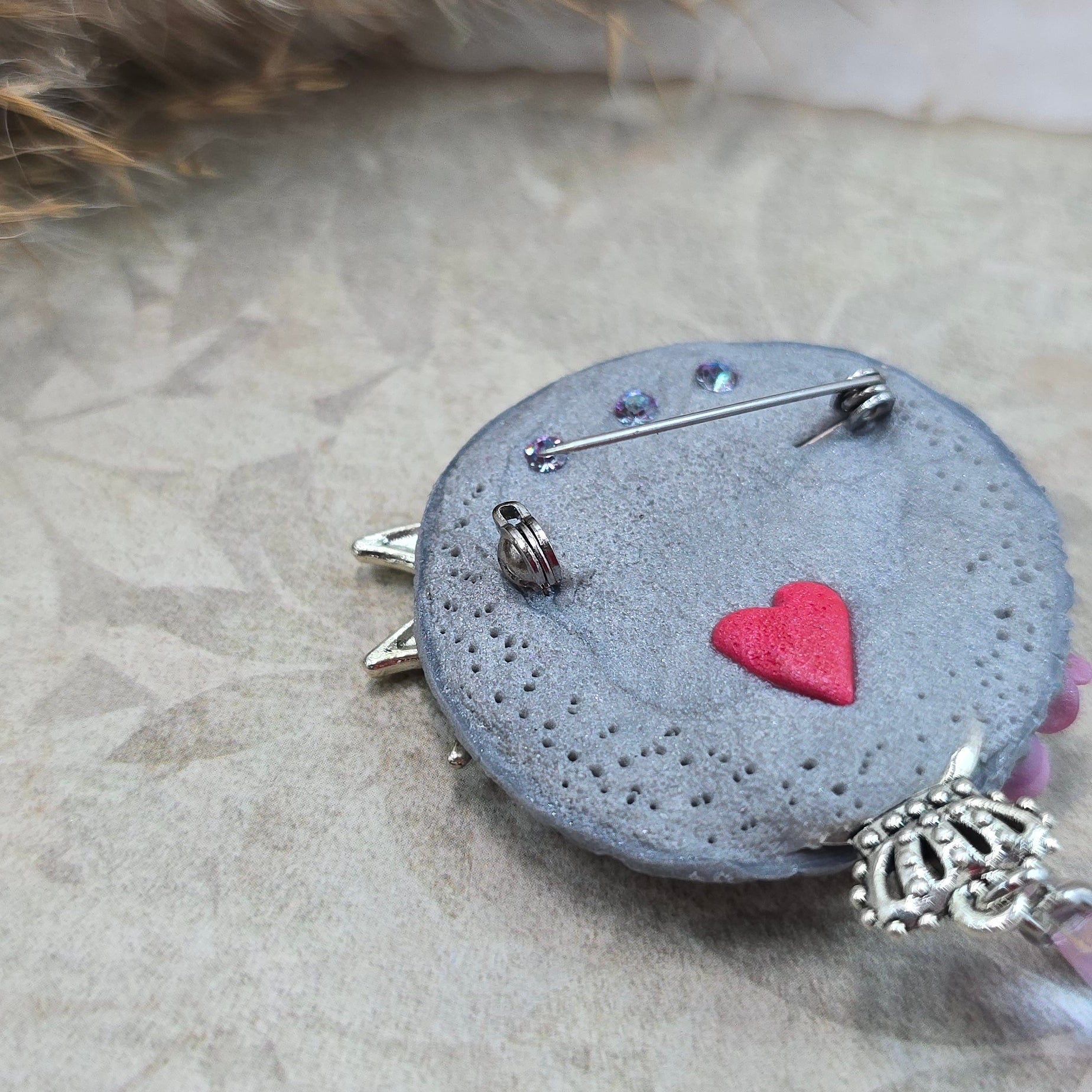 Rankų darbo sagė iš polimerinio molio. Kitoje pusėje yra smagi širdelė.