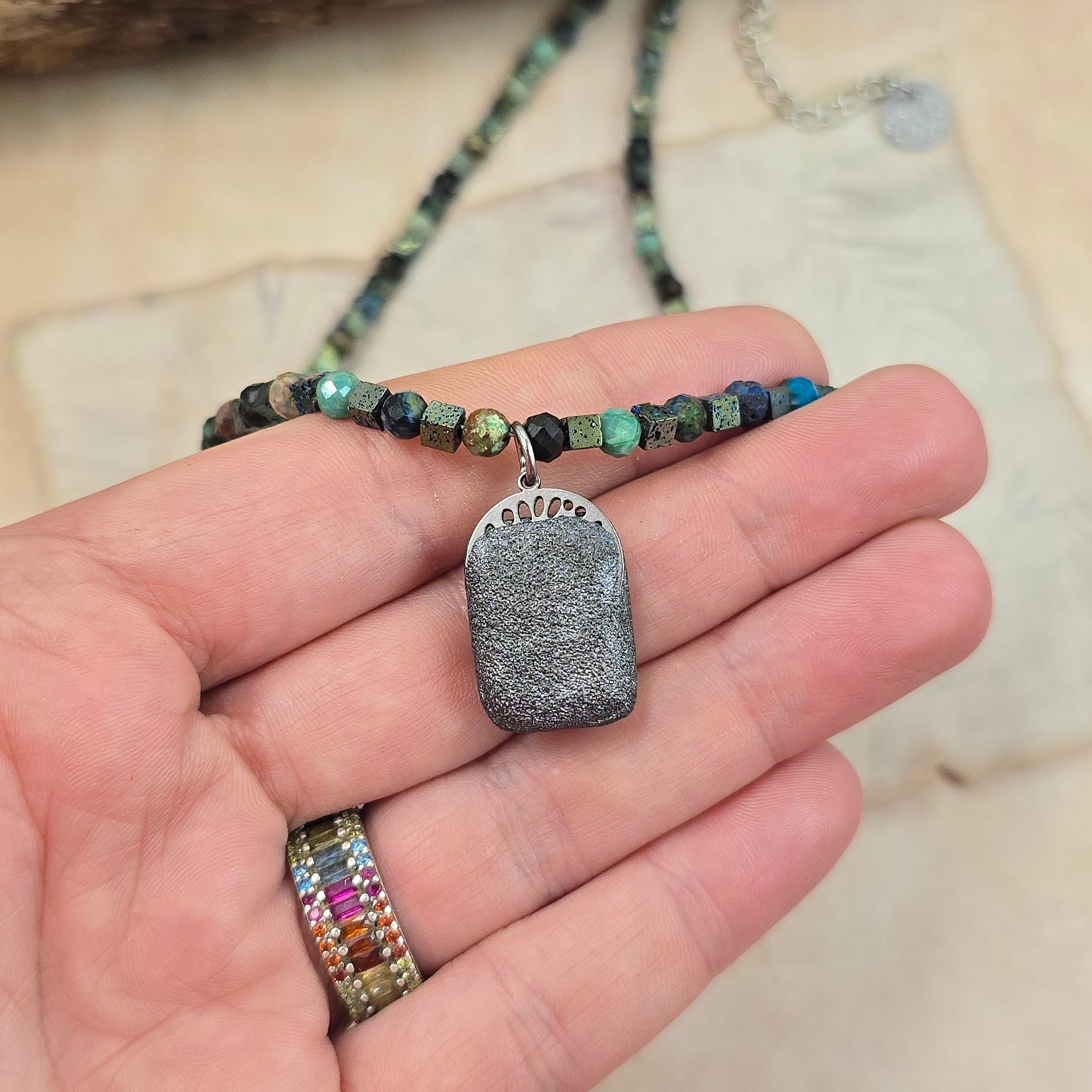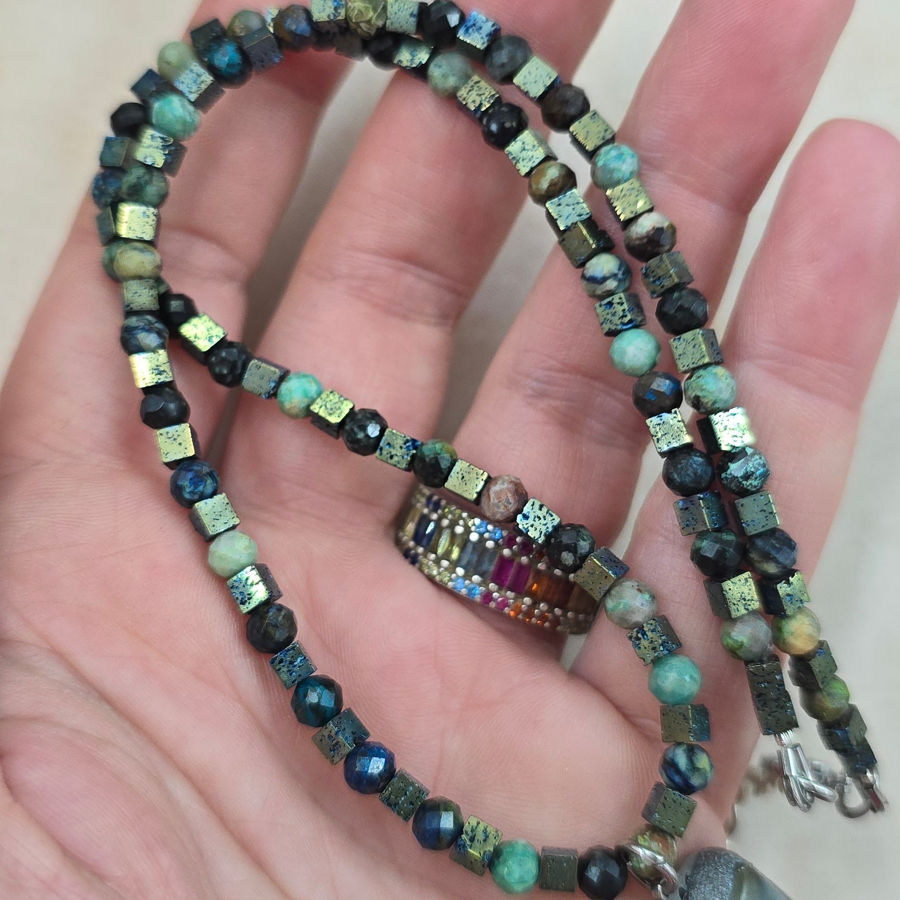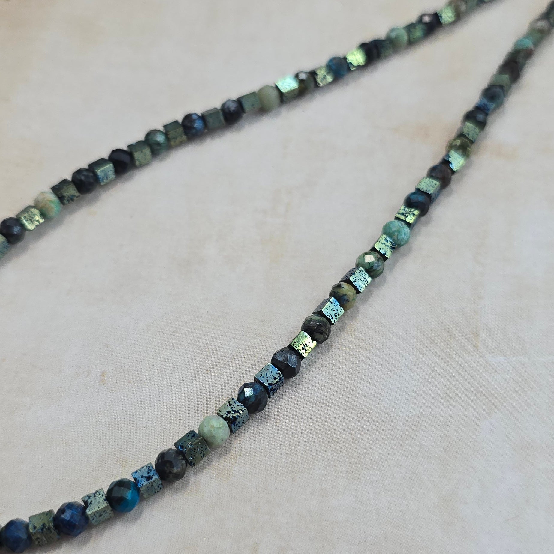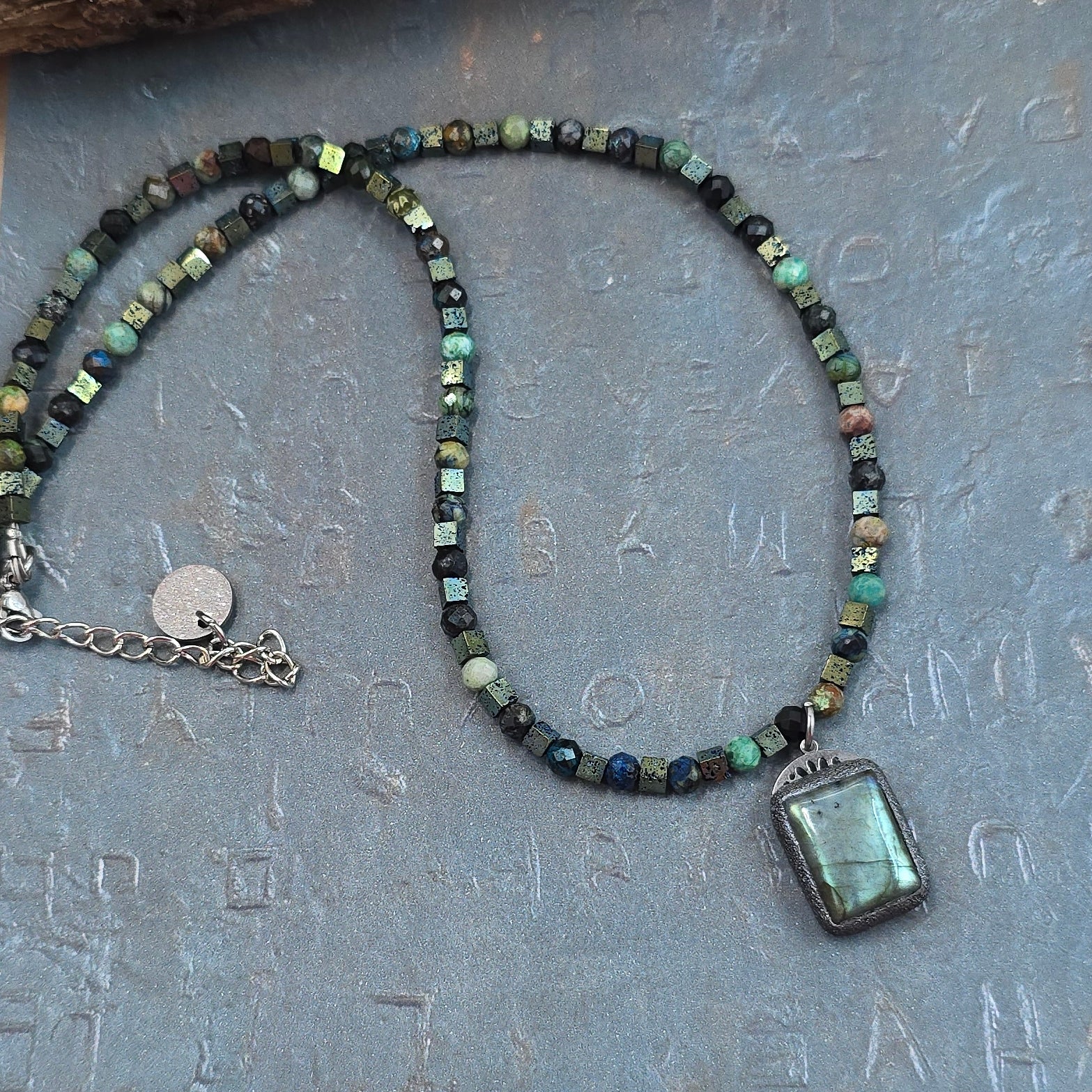 Trumpas vėrinys su labradoritu, turkiu ir hematitu