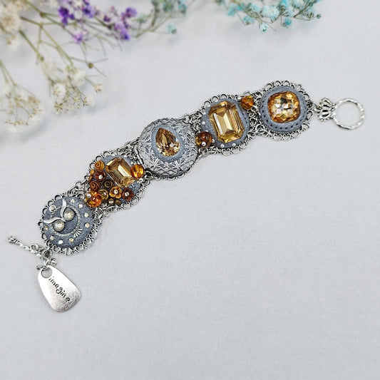 Plati apyrankė su tamsaus aukso spalvos kristalai, atsidarančiu medalionu ir pelėda