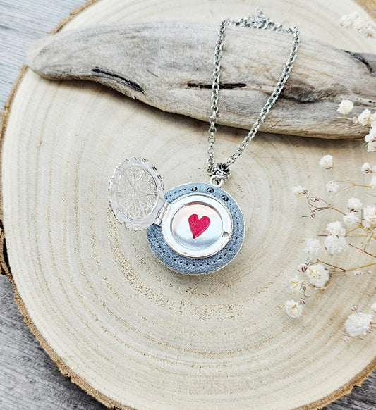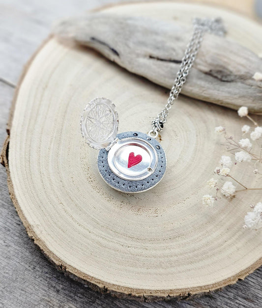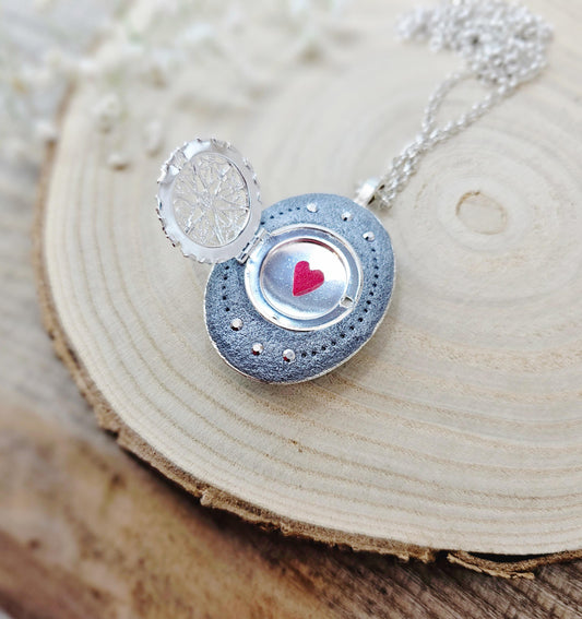Dvipusis sidabro spalvos pakabukas su nuostabiu gintaru ir atsidarančiu medalionu