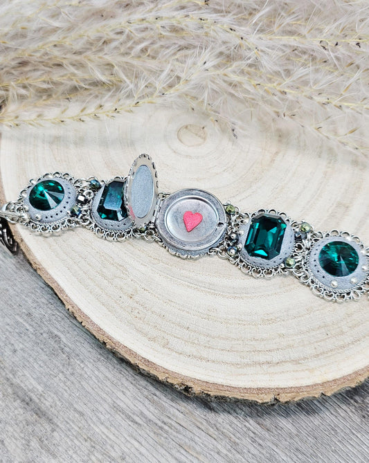 Plati apyrankė su smaragdo spalvos kristalais ir atsidarančiu medalionu