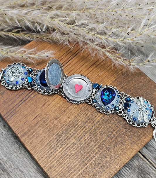 Plati apyrankė su sodriai mėlynais kristalais, atsidarančiu medalionu, laumžirgiu ir gyvybės medžiu
